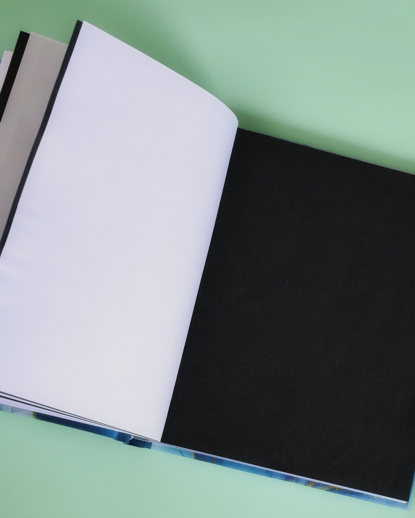 - Las hojas del álbum son negras y están alternadas con hojas separadoras que protegen las fotos.
